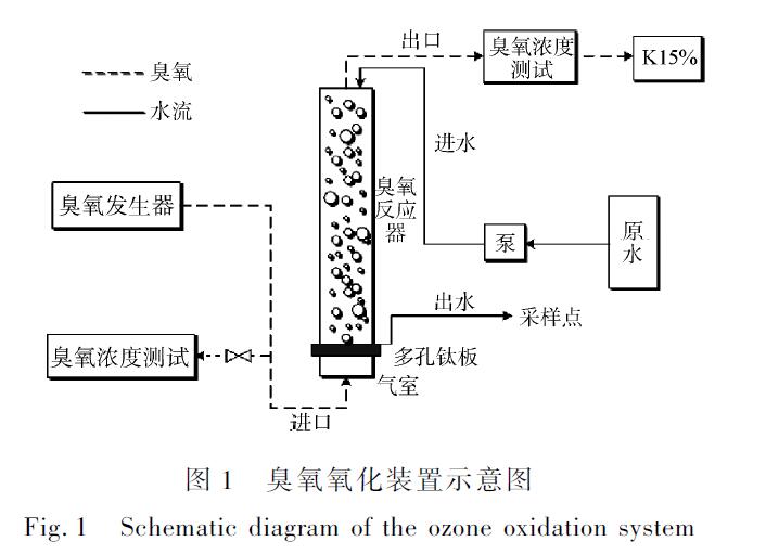 本研究的实验装置如图1所示。臭氧发生器产生臭氧,臭氧接触柱由玻璃制作,总高1.3m,内部直径3.56cm。接触柱内部中空,底部设有气室,采用多孔钛板均匀曝气。接触柱采用下层进气、上层进水,水气交错,以增大接触面积和接触时间。臭氧反应的温度在室温25℃,反应时间为15min,臭氧投加速率为2.1mg·L-1·min-1。