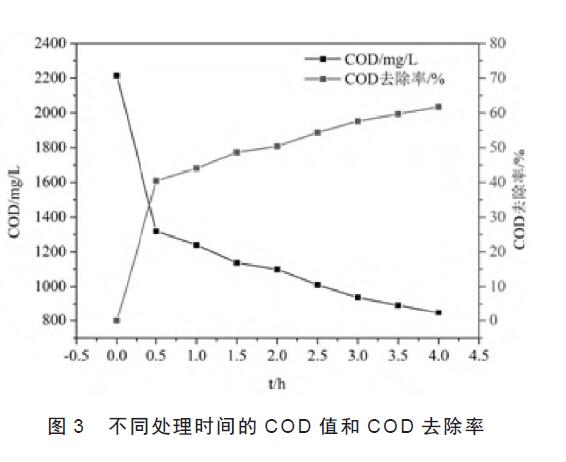 (1)利用电催化、臭氧氧化和电催化+ 臭氧协同技术三种方法处理印染水,电催化+ 臭氧协同技术对废水中COD 去除效果很好,反应4 h 时,废水的COD 去除率达到61.76%。