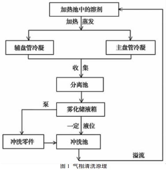 气相清洗利用清洗剂高温气化,气流上升至材料表面,由于温度的差异发生冷凝,清洗剂溶解掉材料表面的杂质,回落到分离池,去除清洗剂中的水分和杂质后,清洗剂再回到加热槽进行气化,如此循环往复实现芯片表面清洗,如图1 所示。