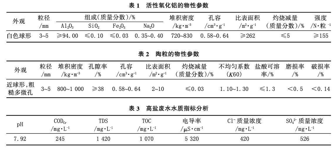 活性氧化铝、陶粒,其物性参数分别见表1、表2。