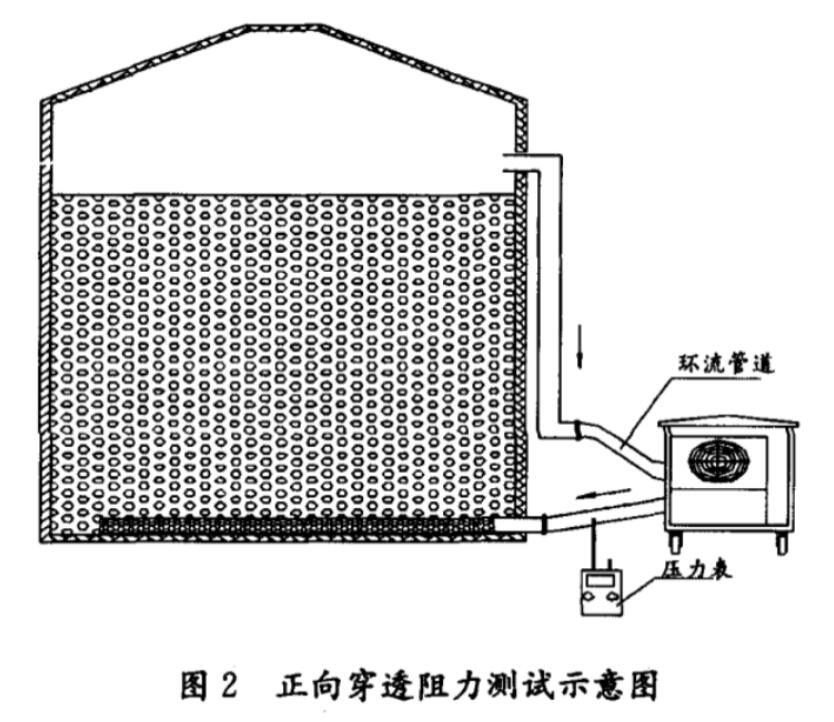 理论计算的粮层阻力都比较小,加上风道阻力也不会超过200Pa。经实际测试,13号小麦仓正向穿透的通风阻力为1000Pa,反向穿透通风阻力700Pa。14号稻谷仓正向穿透阻力为700P,反向穿透阻力460Pa,与理论计算具有一定差异。新粮与陈粮在通风阻力上也有一定差异,因此需要测量出较为完整的数据,包括不同仓型、堆高和粮种的通风总阻力,以便在选用通风机时提供参数。