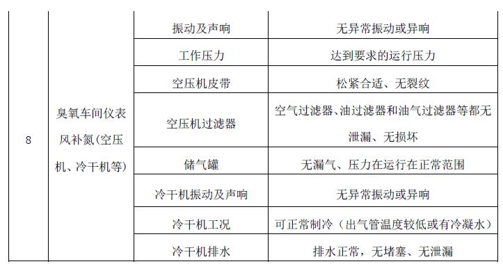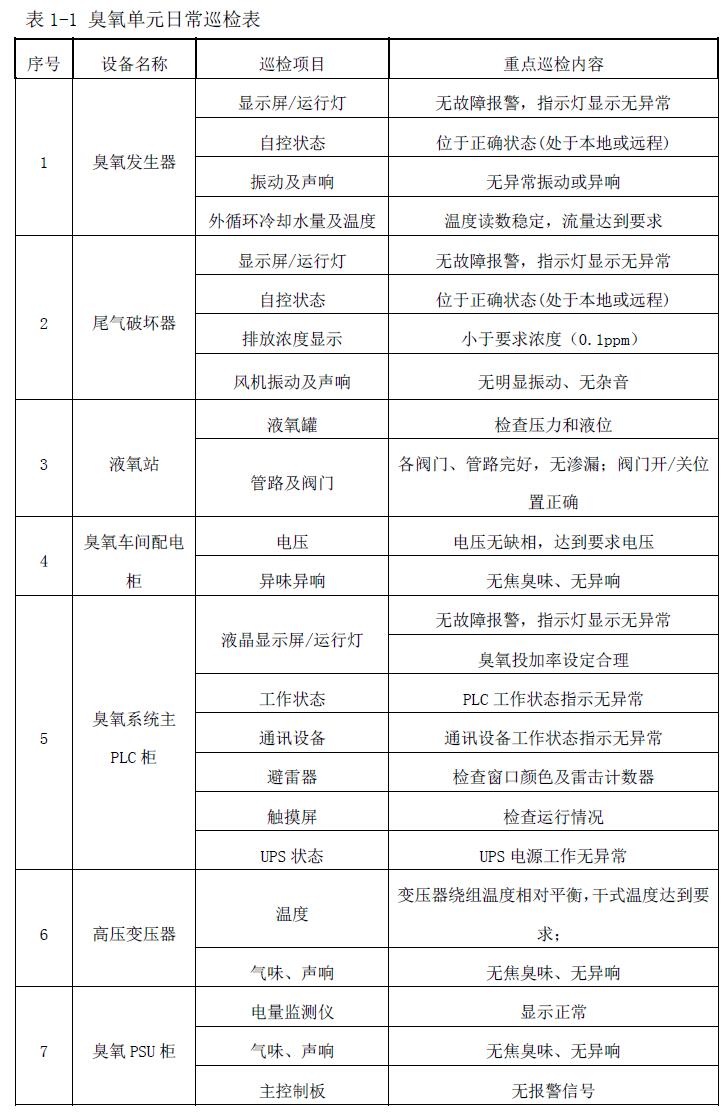 (3)臭氧单元及其配套的控制系统、阀门和管道等附属设备应定期开展日常巡检及清洁、保养工作,且对应的周期、项目及内容应符合实际安全生产要求。(详见表 1-1)