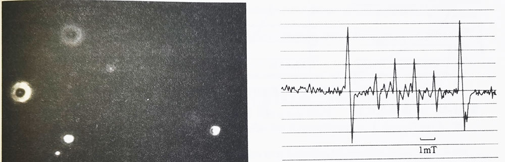图2左空气纳米气泡的显微镜照法        图2右二氧化碳纳米气泡的ESR频谱