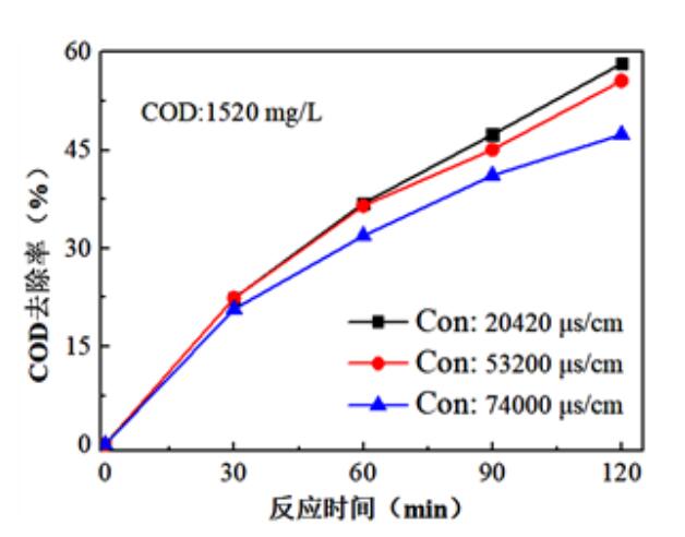 已有研究报道 [16] [17],在高级氧化过程中,无机盐氯离子(Cl−)的存在和增加不仅干扰·OH的生成,还能与产生的·OH反应转化为氧化能力较低的其他自由基,从而抑制催化氧化速率。而对废水中另一种含量较高的无机离子 SO2−4 影响的研究较少,为了探究 SO2−4 离子含量对COD去除率的影响,以进水COD为1520 mg/L (原水稀释1倍,向其中添加不同量无水硫酸钠,使其COD均保持在1520 mg/L,电导分别为20,420 μs/cm、53,200 μs/cm、74,000 μs/cm),气体流速为0.3 L/min,臭氧浓度约30 mg/L条件下进行催化氧化试验,结果见图2。