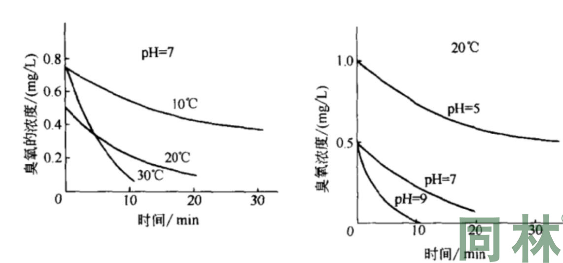臭氧在水中的分解速度随水温和pH值的提高而加快,图1-1为pH=7时,水温和分解速度的关系,图1-2为20℃时,pH和分解速度的关系。