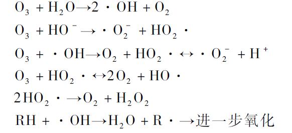 垃圾渗滤液成分复杂,含有多种难降解污染物。垃圾渗滤液在经过生化处理,再经膜处理(更终经反渗透或纳滤处理)之后的出水虽然水质良好,但是经膜处理的截留浓缩液的COD和有机物含量很高,且含有极高浓度的腐殖酸类物质,生化性能极低,难以生化处理。由于浓缩液污染物浓度高、难以生化处理的特性,高级氧化法成为处理浓缩液的一种有效方法。而臭氧氧化法目前被认为是一种新型去除有机难降解有机物的方法,常用于去除高浓度有机废水的色度和难降解有机物,可以有效去除浓缩液中的腐殖酸类物质[317]。Kurniawan等和Tizaoui等认为臭氧氧化法氧化去处水中难降解有机物是自由基过程。臭氧溶于水溶液会发生自分解反应,并产生性质活泼的羟氧自由基(·OH),·OH能够快速破坏水中难降解有机物的分子结构,并能进一步将其矿化成CO,和水: