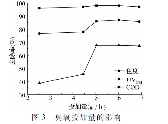 采用碘量法测定臭氧浓度;pH采用酸碱度计测定;采用目视比色法测定浓缩液的色度;UV254采用紫外可见分光光度计测定;采用重铬酸钾滴定法测定浓缩液的COD。采用接种稀释法测定BOD5。采用原子吸收法金属离子浓度。浊度采用浊度仪测定。电导率采用电导率仪测定。