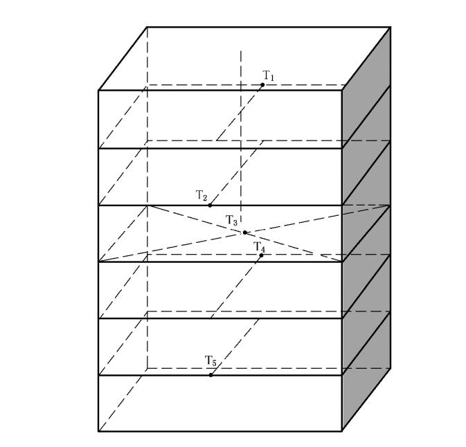 试验在满载状态下进行。柜内各层架按说明书规定的放置方法均匀放人洗净的食具,测量温度传感器置于消毒柜规定测试点上。测试点的分布以层架为基础,柜内只有一个层架的,测试点在层架的中央中间位置。50 I以下在柜的中央中间位置设-一个点。100 L以内的设三个测试点,分别为更.上层架后壁与两侧的中间位置;柜的中央层架中央位置;更下层架门与两侧的中间位置。大于100 L的设五个测试点,除_上述三个测试点外,在更上层架与中央层架的门与两侧中间设一个点;在中央层架与更下层架的后壁与两侧的中间设一个点。测量温度传感器的放置离柜壁和门30mm,并不与其他物体接触。电热食具消毒柜在额定电压下工作,通电至限制温度器动作为第一-次,然后打开柜门,冷却至电源重新能接通,测5次;取第3、4、5 次测试点的更低温度值,应符合产品说明书规定。测试点的分布如图.1、图.2所示。