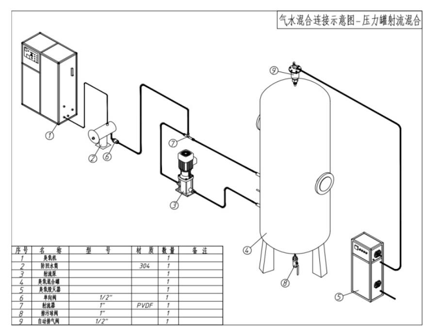 第二种工艺采用负压投加的混合方式,即采用文丘里管或气液混合泵的方式,将臭氧气体与处理的水充分接触混合。