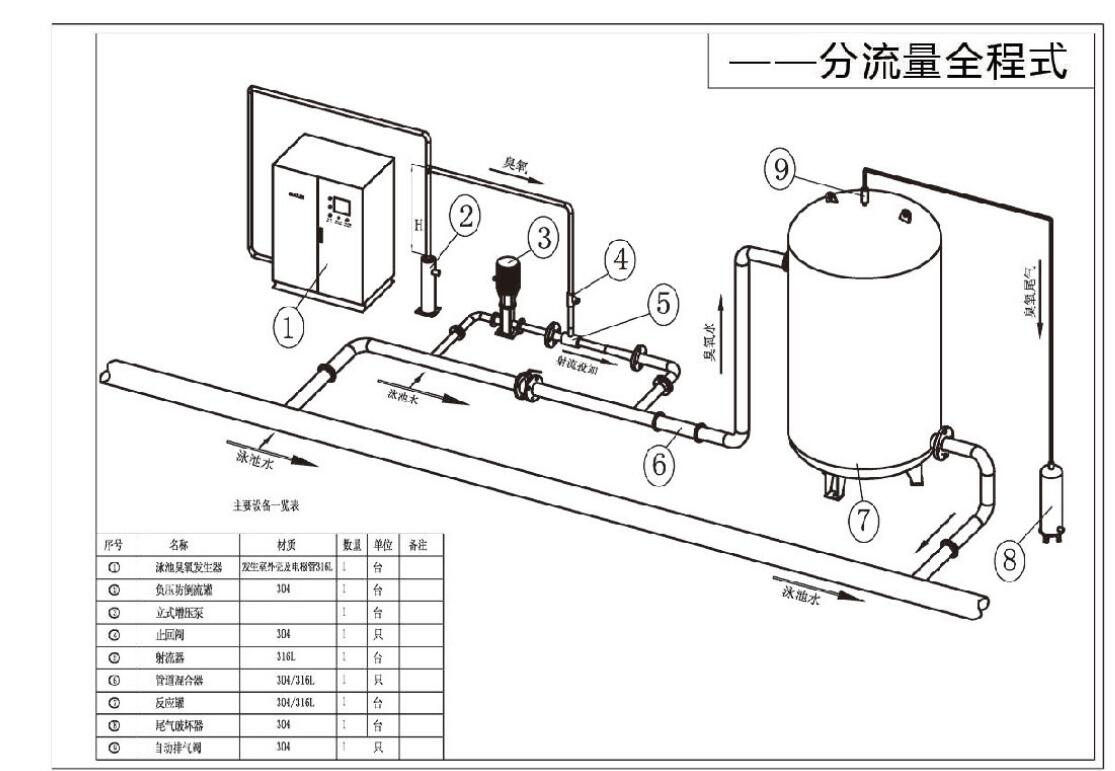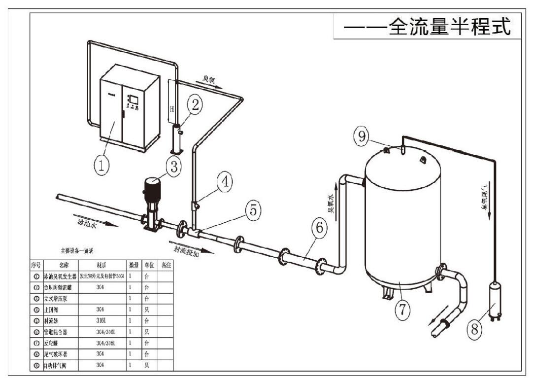 根据泳池消毒技术规程,泳池消毒工艺分全程式和半程式两种工艺,按实际消毒设计要求不同而选择不同,一般通负压的方式将臭氧导入水中,并通过专用混合器进行充分混合,更后通过反应罐及配套设施达到消毒杀菌的要求(即CT≥1.6)。