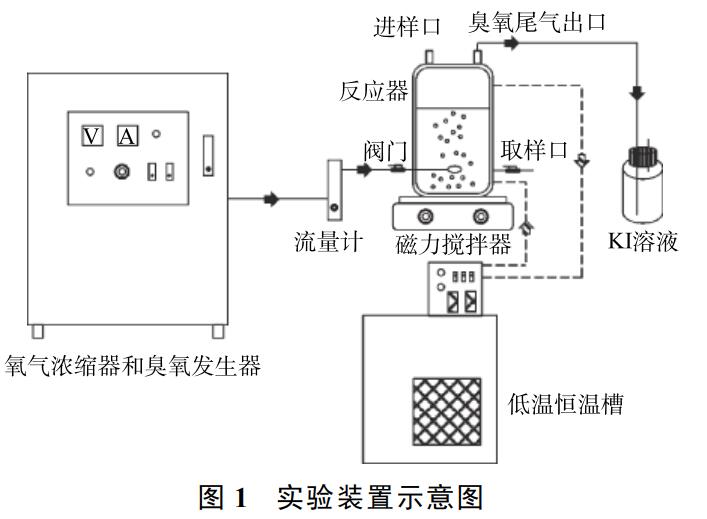 实验装置如图 1 所示。将 1.5 L 垃圾渗滤液注入圆柱形夹套式高硼硅玻璃反应器,反应器内径为 150 mm、高为 200 mm。臭氧由以氧气为气源臭氧发生器产生,其更大臭氧产量为 10 g·h−1,由耐腐蚀转子流量计调节进入反应器的臭氧量,经微孔扩散器进入反应器内??挤从κ?,加入药剂 (H2O2/Na2S2O8/KHSO5),并开启磁力搅拌器。反应过程中温度由低温恒温槽 调控。