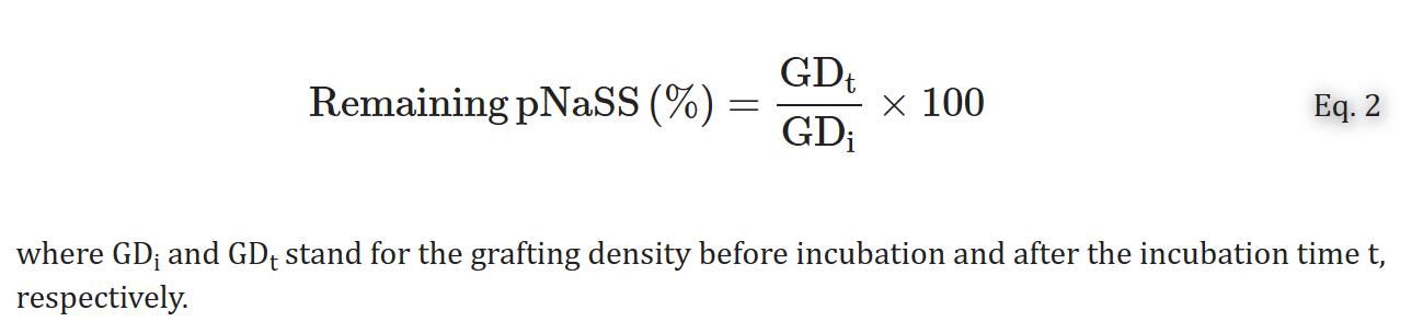 为了研究pNaSS接枝的稳定性,将灭菌的薄膜浸入无菌PBS(pH = 7.1)中,并在37°C下在5%CO的加湿气氛中孵育2在空气中停留不同的时间段。在孵育结束时,监测PBS的pH值,并将样品在PBS中洗涤过夜。通过BT方法测定孵育膜上残留的接枝pNaSS的量,并根据公式2计算: