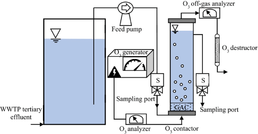 臭氧通常用于处理地表水和地下水以生产饮用水[18]。臭氧化的一个主要方面是确定臭氧应用点在处理序列中的很好的位置,这取决于处理目的[19]。臭氧可用于水处理的早期阶段(预臭氧化),目的是消除味道和气味化合物、氧化无机污染物(如铁和锰)、增强混凝或消除DBP前体[18]。当采用臭氧氧化法去除铁和锰时,应进行沉淀或过滤以去除产生的不溶性氧化物[12,19]。在初级消毒的中间或近端阶段也使用臭氧[18]。在这些应用中,原水在臭氧化之前经过处理步骤(如混凝-絮凝/沉淀和过滤过程)以去除颗粒物,因为颗粒物引起的高浊度可以保护微生物免受臭氧攻击,从而降低消毒效果[12]。