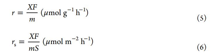 式中,Cin和Cout分别为进口和出口臭氧浓度。为了进一步表征反应的活性,将反应速率(r)和比反应速率(rs)用催化剂重量和催化剂的比表面积(SSA)归一化如下