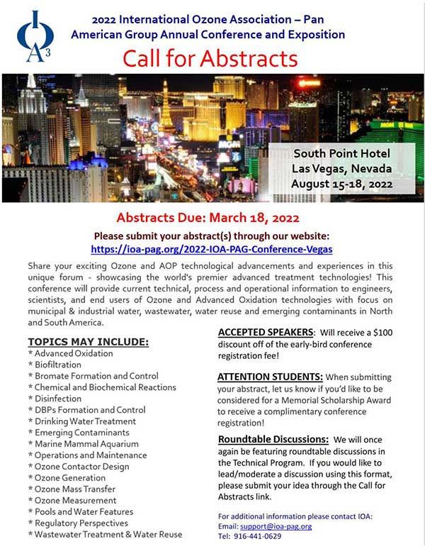 2022国际臭氧协会年会 在这个独特的论坛上分享你激动人心的Ozone和AOP技术进步和经验,展示世界领先的先进处理技术!本次会议将为臭氧和高级氧化技术的工程师、科学家和终端用户提
