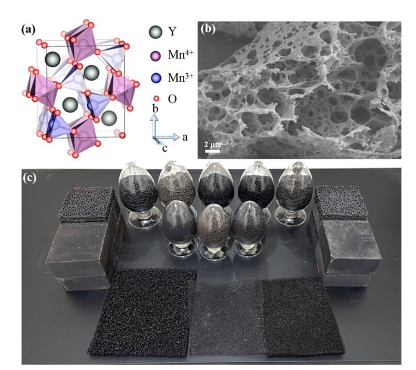 图1.YMn2O5高效催化高浓度臭氧分解为氧气,并能在超低温(a)及高湿度(b,c)环境下长时间保持稳定。(120ppm O3/Air,质量空速WHSV=600,000mL·g-1·h-1,RH:相对湿度)