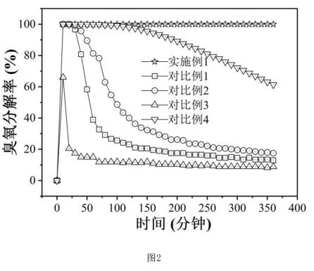 [0034] 图2是实施例1和对比例1~4中的臭氧分解率随时间变化图。