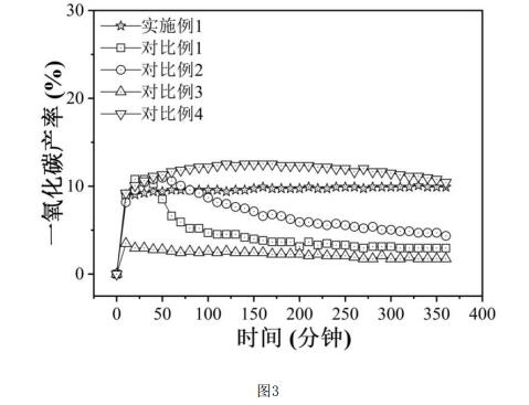[0035] 图3是实施例1和对比例1~4中的一氧化碳产率随时间变化图。